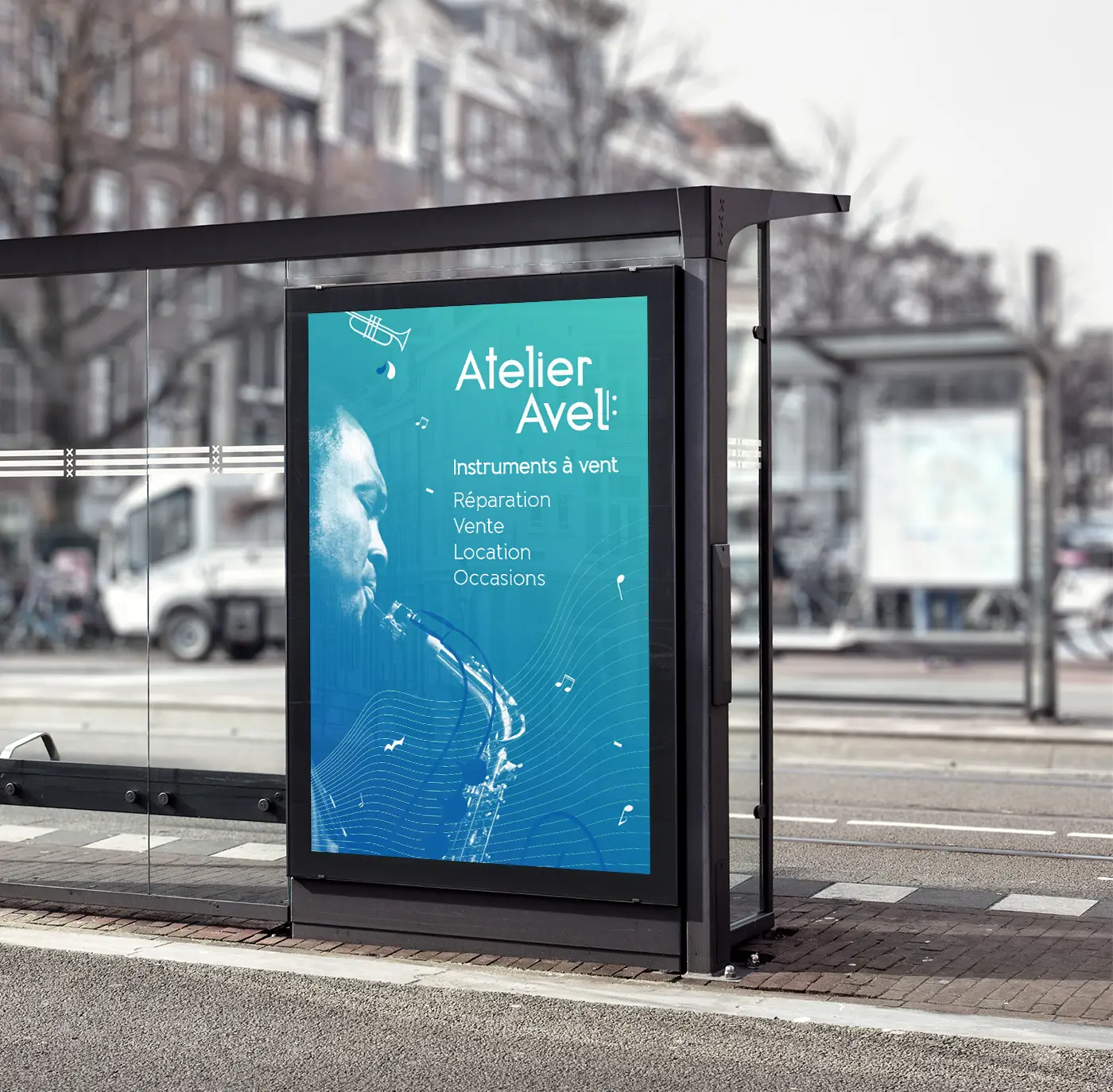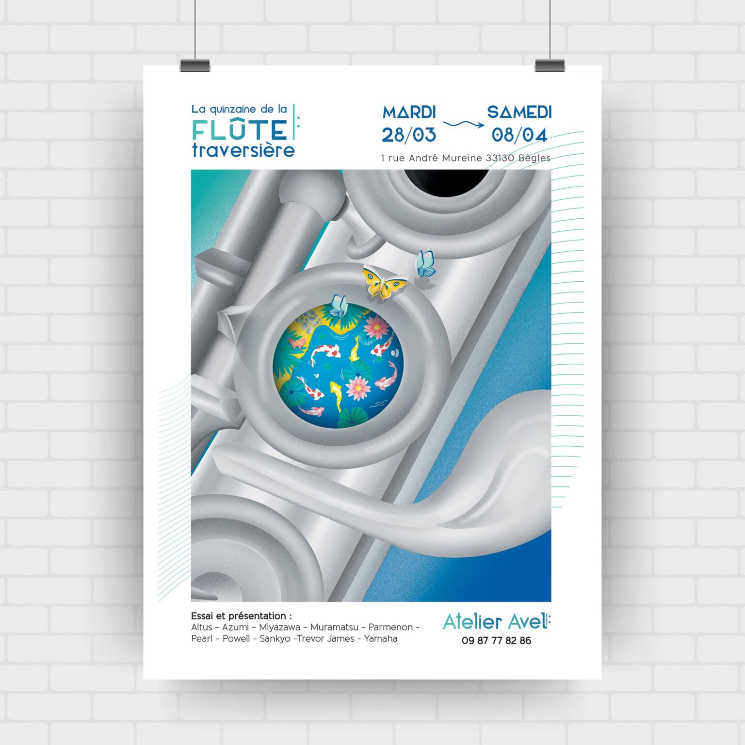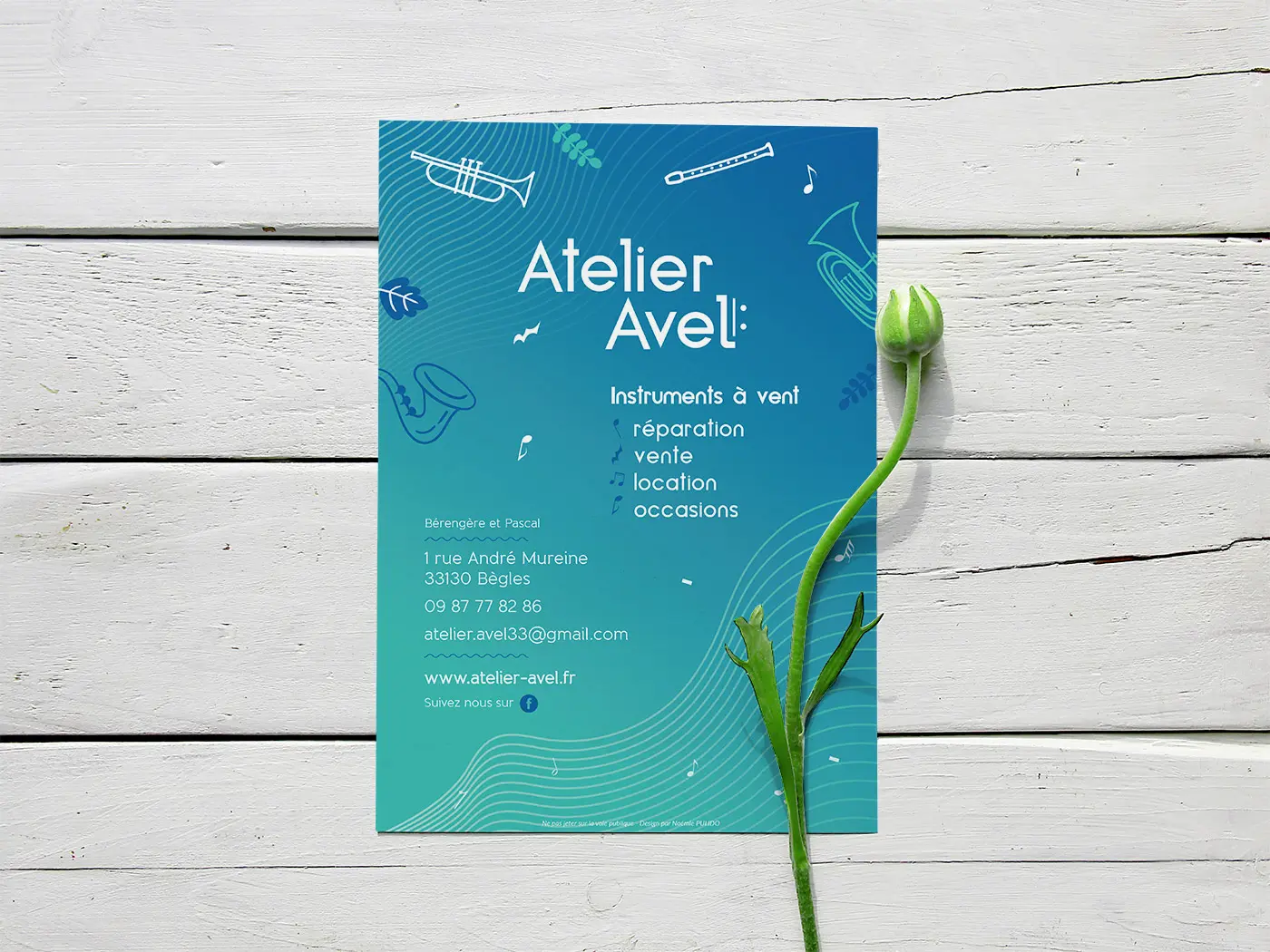 Création de l’identité visuelle, d’une affiche publicitaire, d’un flyer et d’une affiche pour un évènement (quinzaine de la flûte) pour l’atelier de réparation d’instruments à vent AVEL.
