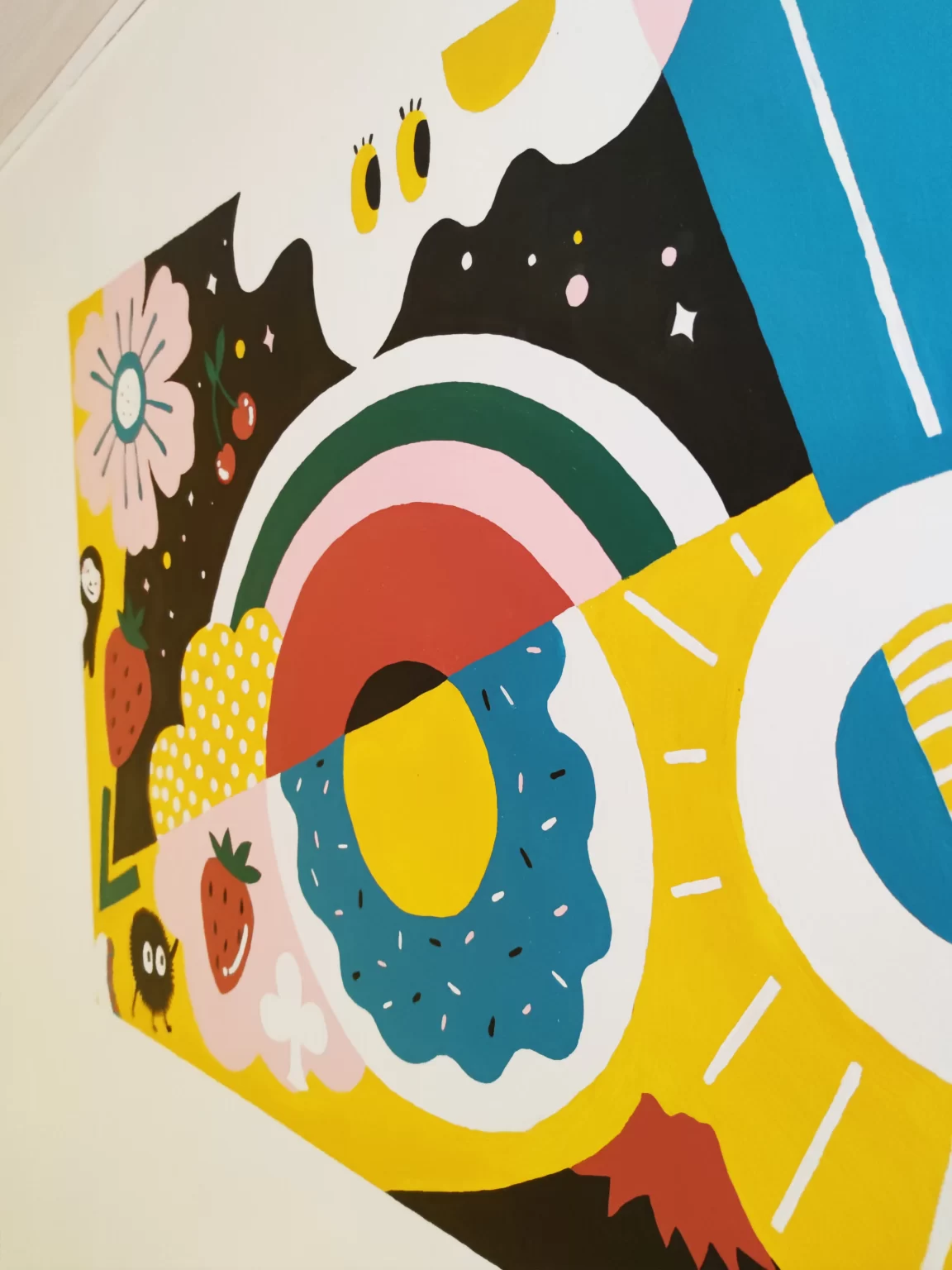Premier travail au papier/crayon, puis passage au propre en numérique (avec le logiciel Procreate), et enfin transposition sur un mur à la peinture acrylique.